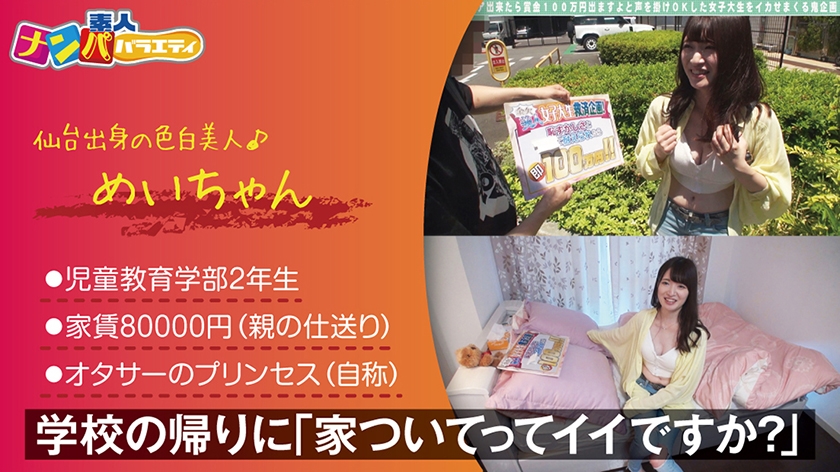 #20歳 #大学2年生 #教育学部 #仙台出身大学近くの住宅街を歩くウブな女子大生「めい」ちゃんをガチナンパ! 「恥ずかしさと引き換えにお金が稼げるバイト」と誘うと、夏休みにお金を使いすぎためいちゃんはお金に釣られ、「家でいいなら…」とお部屋に入れてくれました。それにしても、めいちゃんは本ッ当の美人。ピンクを基調とした部屋がキャラにぴったり。あれ? シーツにシミ? 枕元に大量のゴム? 「気のせいですぅ。恥ずい」。部屋にはカフェバイトで出会った彼氏もよく来るそうで、一緒に映画を観たり、まったり?したり(笑)これまでカラダの関係は3人くらい? 「エッチは好き♪」というので、下着姿にして生足を抱きしめ、Dキスすると性欲に火が(笑) パンツが濡れてる(笑)パイパンオナニーでマジイキ!手枷に電マで潮!「彼氏ともこんなに潮吹いたことないのにぃぃ」とベッドは大洪水。耐えきれずに何度も潮を吹くので罰ゲームは即ハメ!「1番好きなのは正常位、2番目は騎乗位」というので、騎乗位からデカチンイン!「待って待って出る出る!」と叫びながらのM字ピス&突き上げピス!で2発中出し! さらに手マンと1番好きな正常位で追いイカされ、「壁薄いのにぃ…、隣に聞こえるからやめてくらさぁ~い!」と喘ぎまくるお口を精子で塞いで、ベロチュー。バイト代もGETしてニッコニコ。最後は「彼氏より気持ちいぃ」と投げキッスとピース!